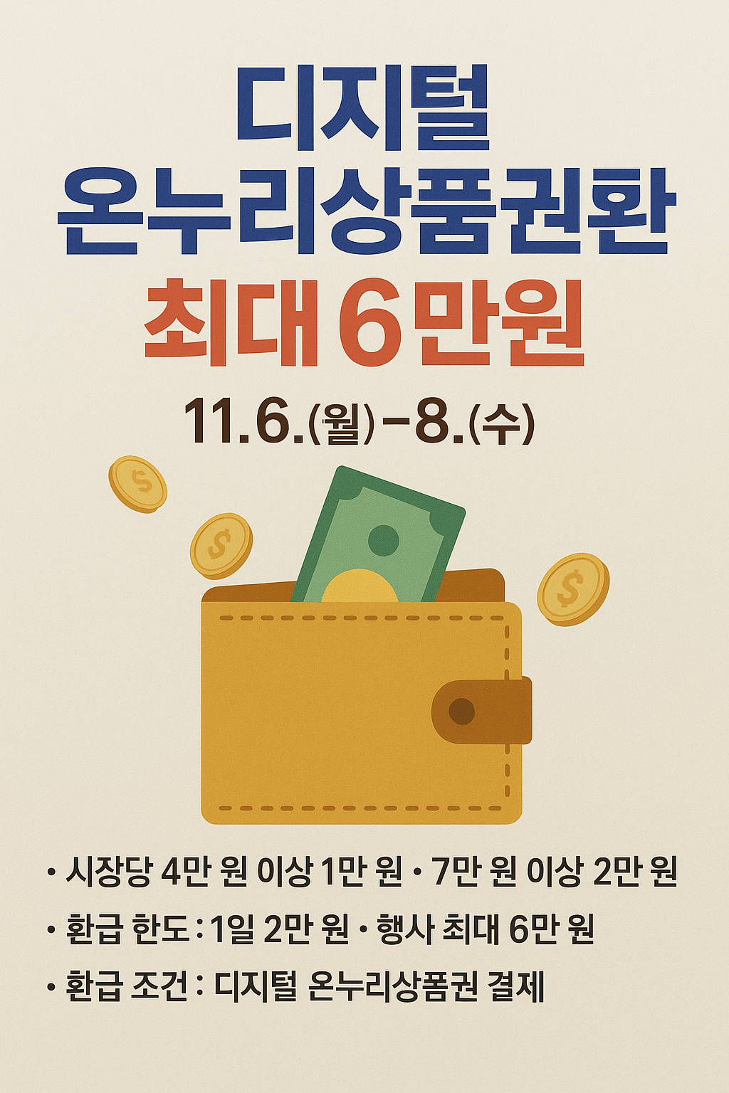 전통시장을 자주 이용하시는 분들께 특히 유리하며, 기간·조건을 잘 확인하고 참여하면 최대 6만원의 혜택을 받을 수 있습니다.